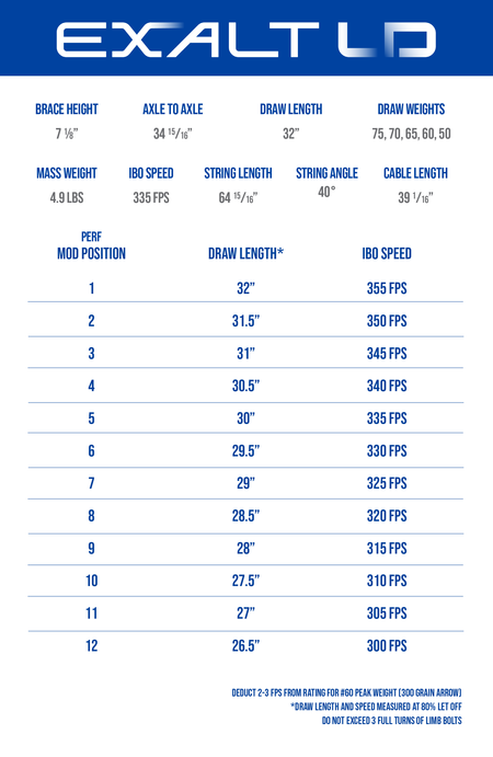 Offering draw lengths from 26.5" to 32" and performance mod IBO speeds up to 335 FPS, the Exalt-LD provides forgiving adjustability with a customized setup.